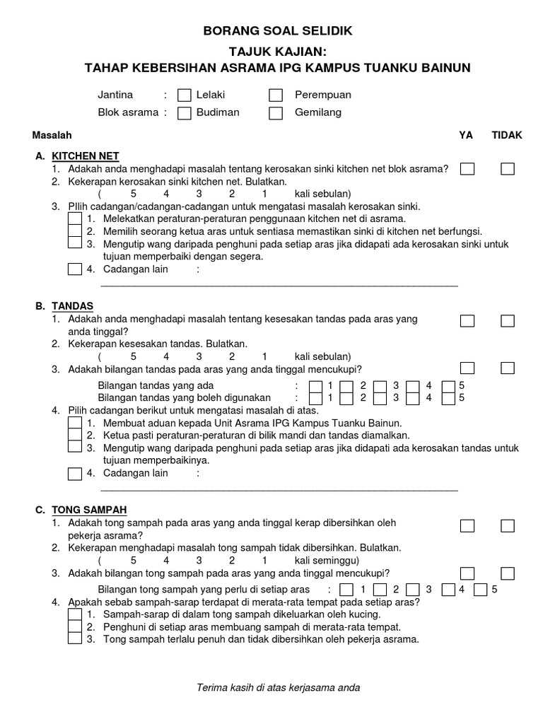 Kaji Selidik Bajet 2022 03 Jun 2022 HASILIAN RESEARCH SNAPSHOT HRS 27 Mei 2022 e-Buletin Hasil Edisi 52022. Maklumat demografi ini akan disediakan di Bahagian A dalam borang soal selidik dan 1 soalan akan disediakan dalam Bahagian B serta 10 soalan dalam Bahagian C dalam borang soal selidik. Borang permohonan asal serta dokumen-dokumen sokongan hendaklah di hantar ke Pejabat Daerah dan Tanah Gombak berserta Slip Pengesahan Permohonan untuk proses seterusnya.